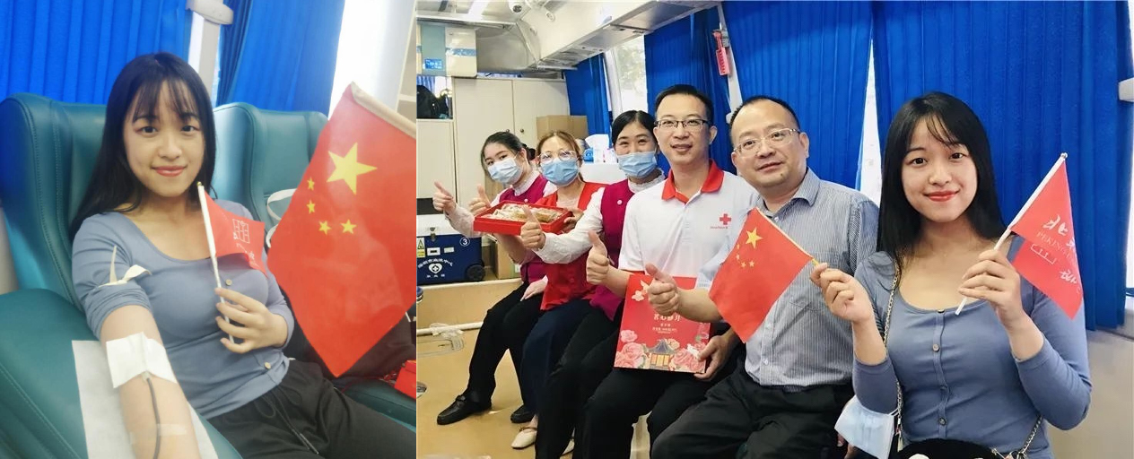 2020年10月1日除了是中秋、国庆之外,也是我国颁布实施《中华人民共和国献血法》22周年的纪念日。团支书詹家鳍语同学以身作则,自发前往西丽天虹捐血车献血并与工作人员和爱心献血人士们共庆双节。詹同学说,“今天献血的爱心人士格外的多,虽然年龄、工作、口音千差万别,但是为祖国献血的决心是一样的,我希望通过献血来为国家、为社会做出贡献,非常荣幸能够成为他们中的一员。”