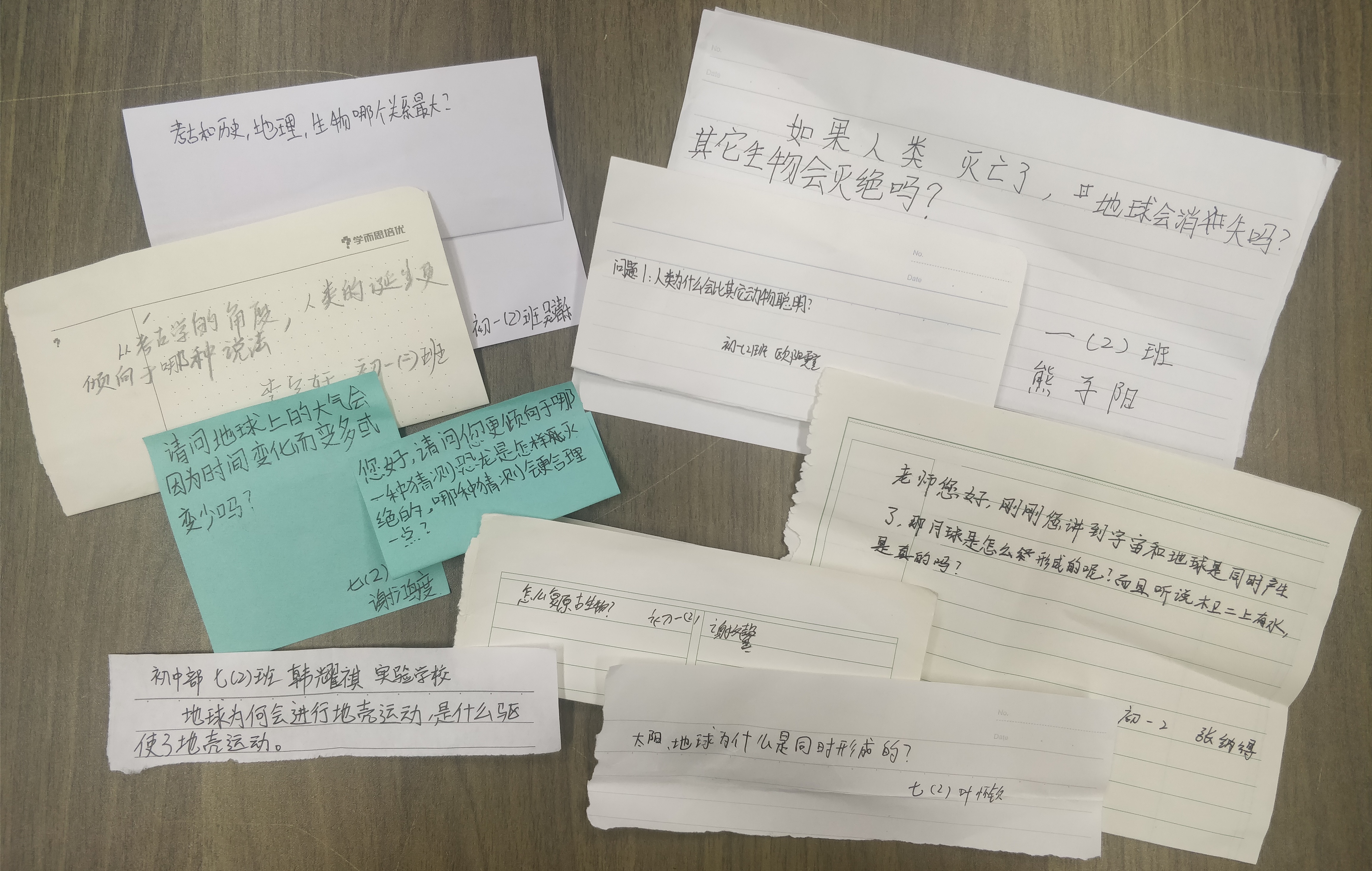 讲座后的提问环节,同学们运用新学习到的知识并展开联想,积极提问,白志强老师进一步地介绍了确认地层年代的地层层序法、生物比较法以及根据元素衰减的测年法等。各会场负责人也从所在的会场收集到了许多孩子们受到讲座启发而提出的问题,写满提问的纸条承载的不止是孩子们的好奇心和想象力,更是对未知事物的探索欲望和对知识的求索。白志强老师在讲座的最后鼓励每位同学好好的培育、爱护自己的好奇心,踏实认真地学习,掌握最基础基本的技能和知识,为自己未来探索地球上的谜和揭示自然规律做出贡献。